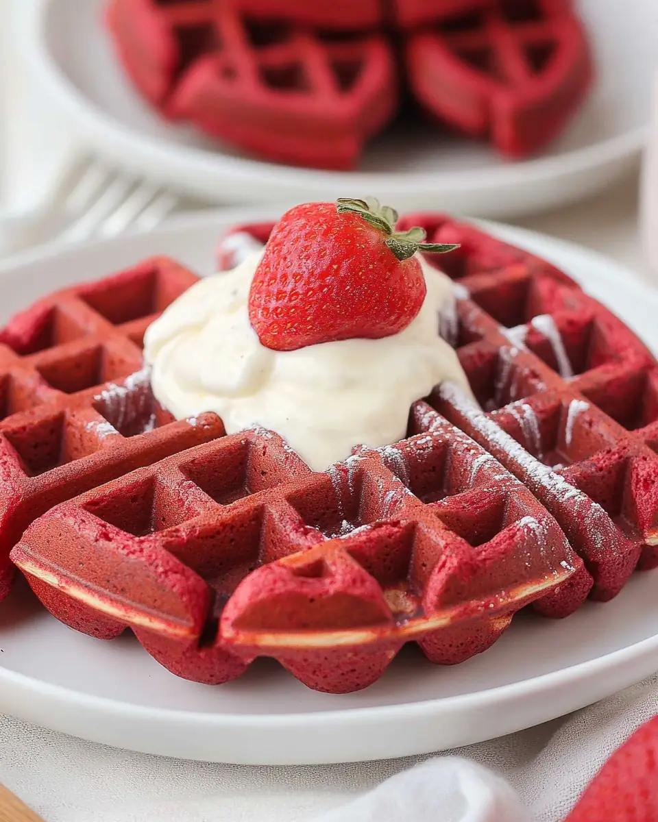 These Red Velvet Waffles are a delightful twist on a classic dessert, perfect for breakfast or brunch. Served with a rich cream cheese topping, they’re sure to impress!