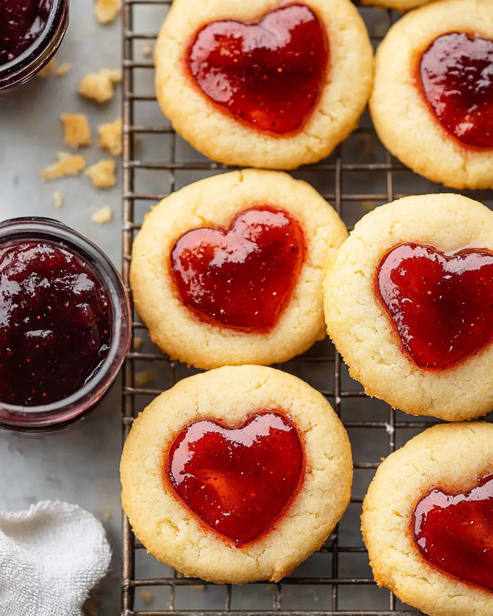 The heart-shaped design with jam accents not only tastes great but also looks stunning on any dessert table. The vibrant red of the jam peeking through the golden shortbread makes these cookies as pretty as they are delicious, perfect for special occasions or as a thoughtful homemade gift.