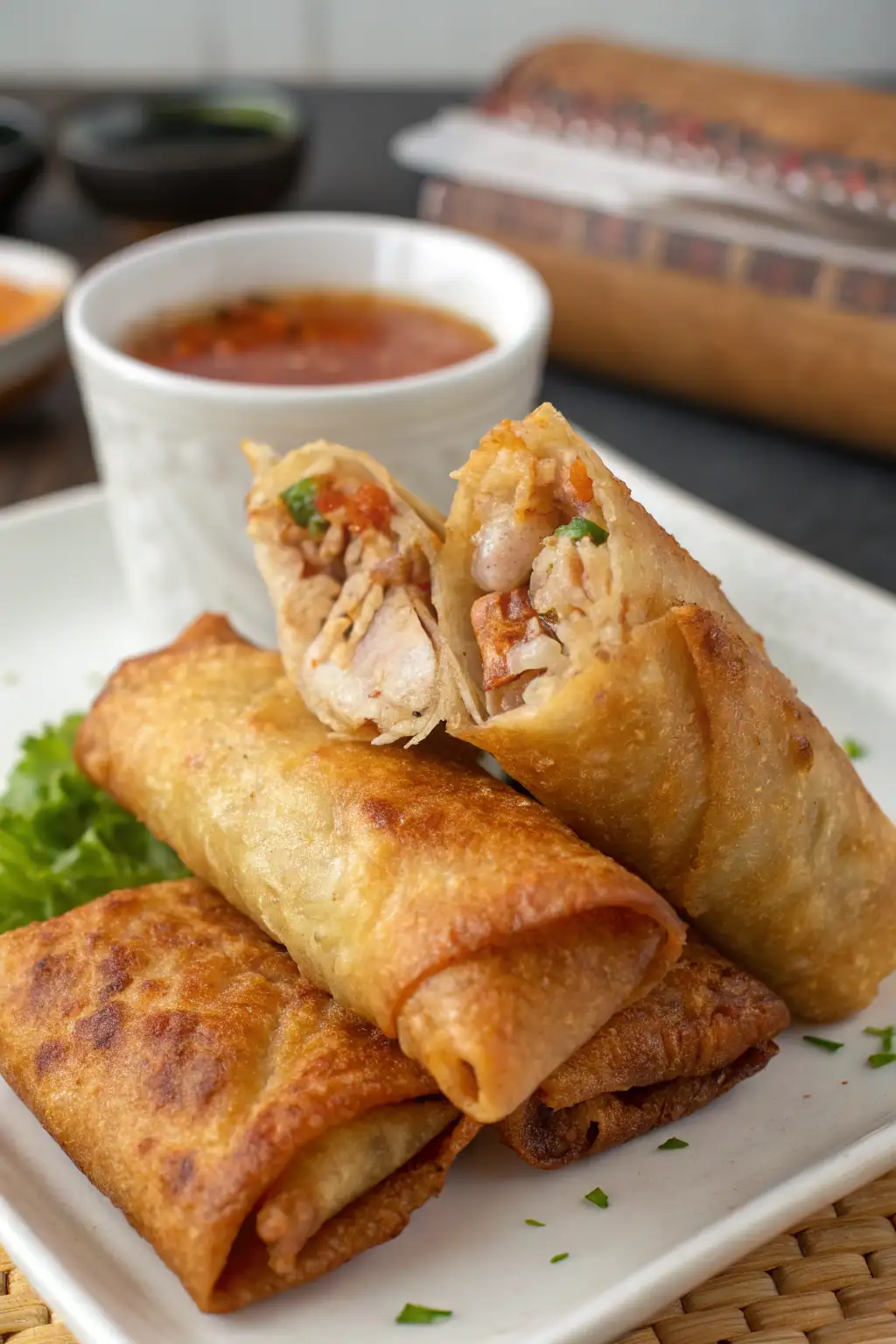 Suggestion 1: Serve with a side of steamed jasmine rice for a complete meal. The fragrant rice pairs well with the savory spring rolls, creating a balanced dish.